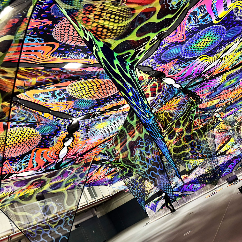 20x35m gespannt, Lochmuster Neonstoffe als knallige Deckendeko in Eventhalle
