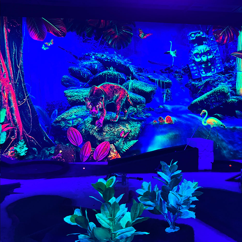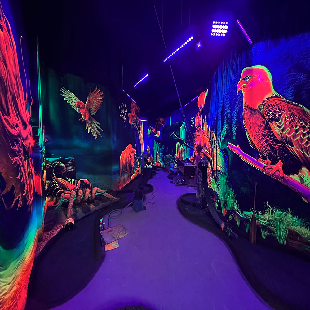 Full-on Neonevent, Neondruck auf Messeboden Rollenware und extrem viel Neondeko